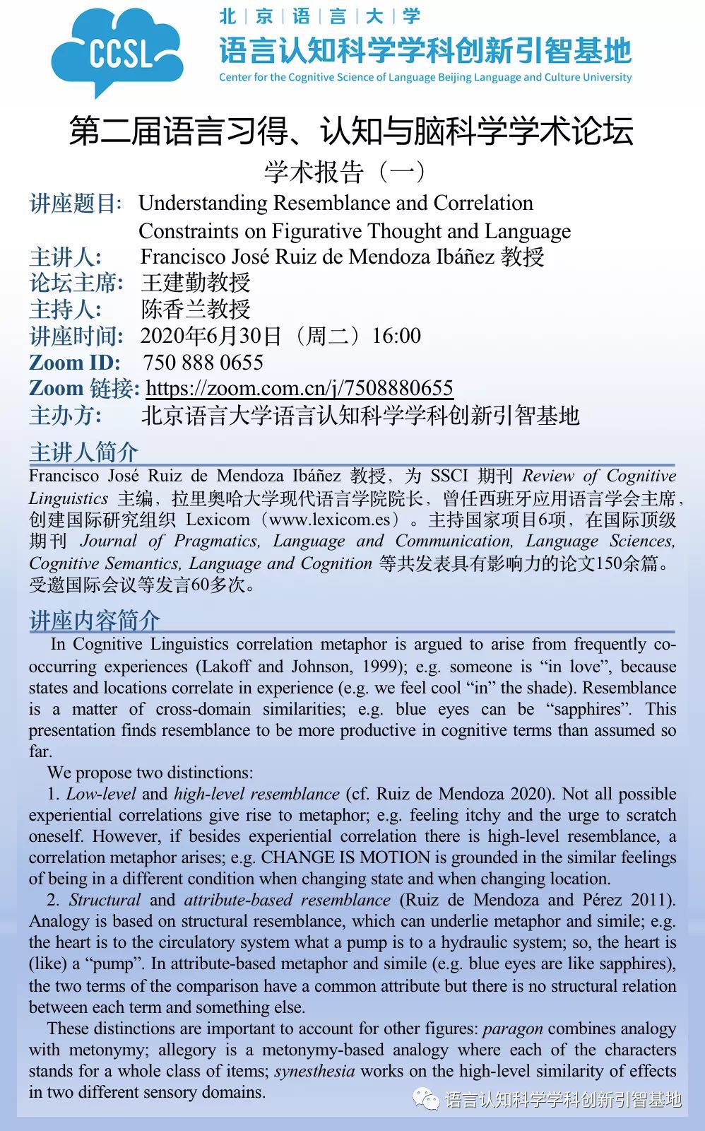 Francisco José Ruiz de Mendoza Ibáñez教授,为SSCI期刊Review of Cognitive Linguistics主编,拉里奥哈大学现代语言学院院长,曾任西班牙应用语言学会主席,创建国际研究组织Lexicom(www.lexicom.es)。主持国家项目6项,在国际顶级期刊Journal of Pragmatics, Language and Communication, Language Sciences, Cognitive Semantics, Language and Cognition等共发表具有影响力的论文150余篇。受邀国际会议等发言60多次。