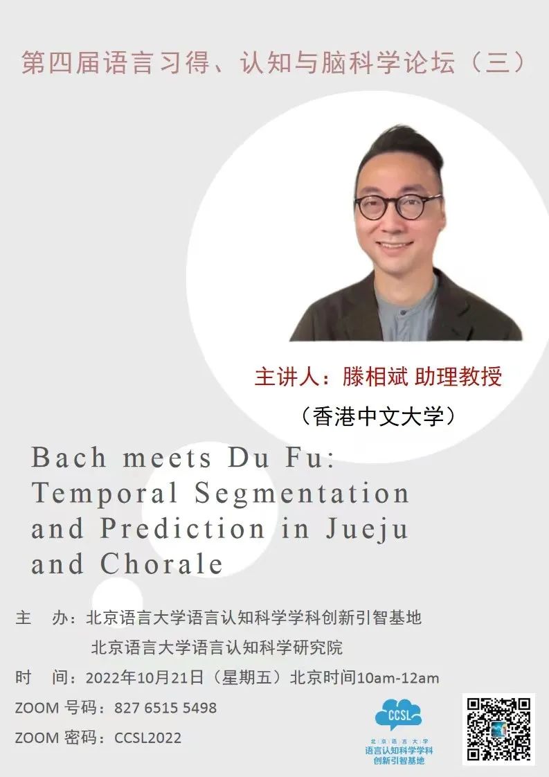 Spoken language and music are characterized by hierarchical structures that unfold over time. Listening to speech and music, therefore, requires the brain not only to process syllables or notes, but also to internally construct high-level linguistic and musical structures (e.g., words and phrases; beats and motifs) and anticipate incoming contents. In this talk, I will present two studies on ancient Chinese poetry and Western classical music, in which we probed mechanisms of hierarchical structure building and prediction in speech and music perception. Using MEG and EEG recording, we discovered low-frequency neural oscillatory components (< 1Hz) that reliably parsed musical and linguistic high-level structures. We next identified a phenomenon – phase precession, suggesting that listeners established structural predictions for high-level structural boundaries. The data reveal candidate brain mechanisms that listeners use to segment continuous music and speech streams and to predict abstract structural linguistic and musical features.