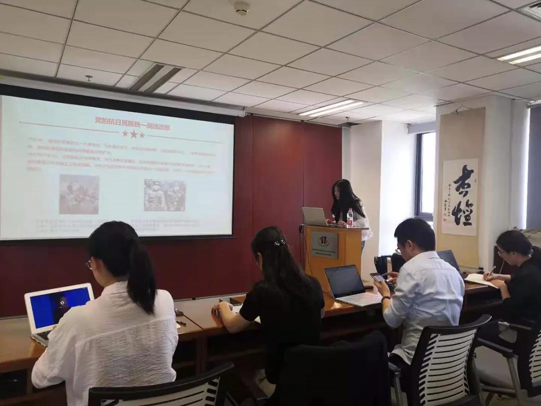 2021年5月12日下午,语言认知科学学科创新引智基地开展教师理论学习,本次教师理论学习主讲人为任可歆老师,题目为“抗战胜利 铭记历史”,理论学习以线上线下相结合的形式举行,不能来现场的老师在线上参加了学习和讨论。