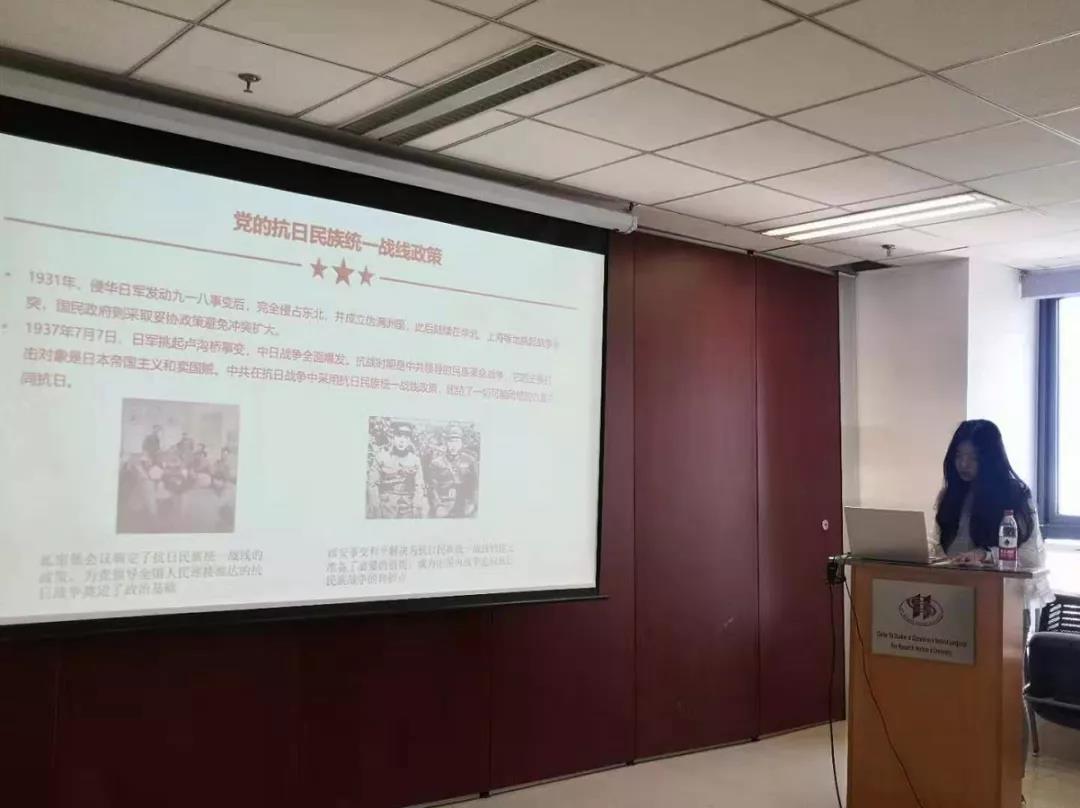 任老师首先简要介绍了中国抗日战争历史、党的抗日民族统一战线政策、中国共产党第七次全国代表大会召开、抗日战争取得胜利的历史意义等内容。其次,播放了“九•一八”事变,“七•七”事变以及抗战胜利日军投降等三个党史学习视频资料。最后,各位老师畅谈学习心得和切身感受。