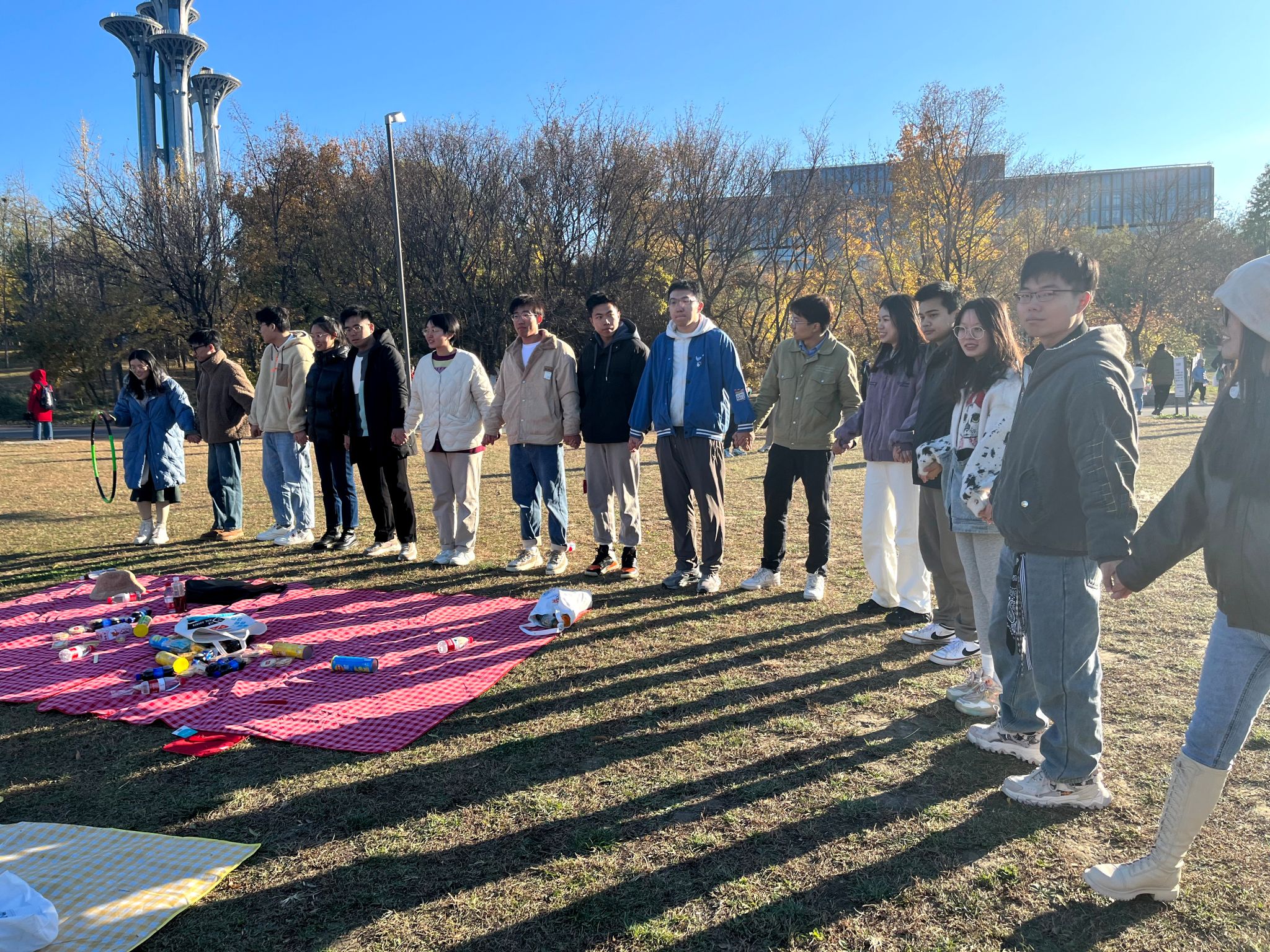 活动首先通过抽签分为两组,依次自我介绍后,进行正话反说、终极密码组内破冰活动,同学们互相配合,完成了背夹气球、穿呼啦圈、夹乒乓球、以“鹅”传“鹅”等组间积分赛。活动有序进行,精心准备的游戏让同学们很快熟悉起来。大家在奥森的大草坪上交流学习生活,现场充满欢声笑语。