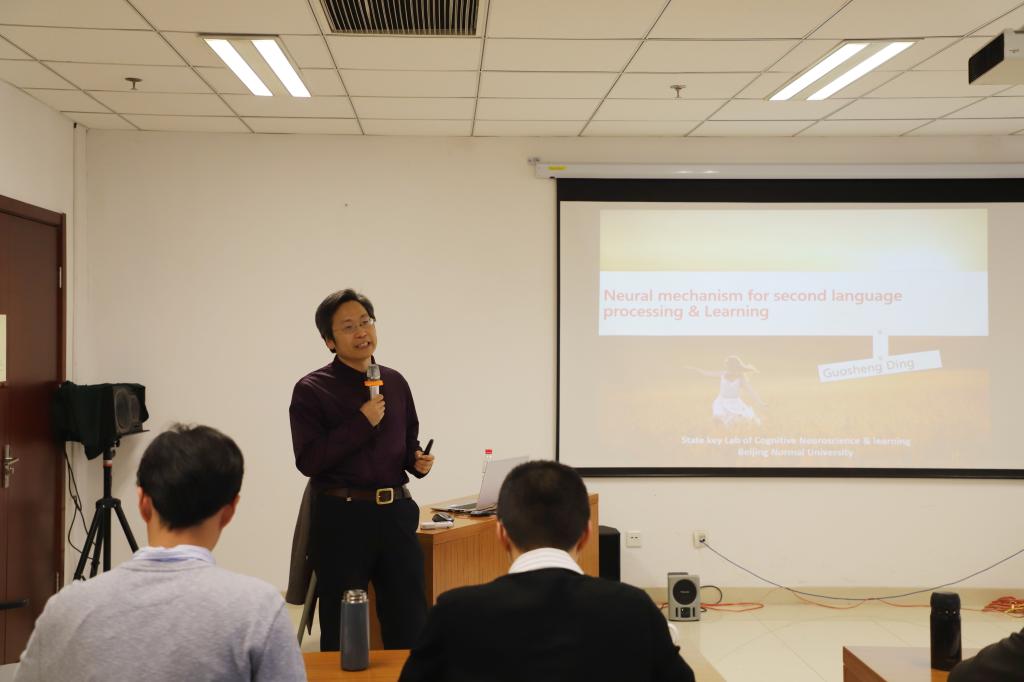 2019年12月4日,北京师范大学认知神经科学与学习国家重点实验室丁国盛教授应邀来我校做学术讲座,讲座题目为“二语学习的神经基础”。本次讲座为引智中心“语言、认知与脑科学系列讲座”第八讲,中心研究人员魏岩军博士主持,校内外师生共50余人聆听报告。