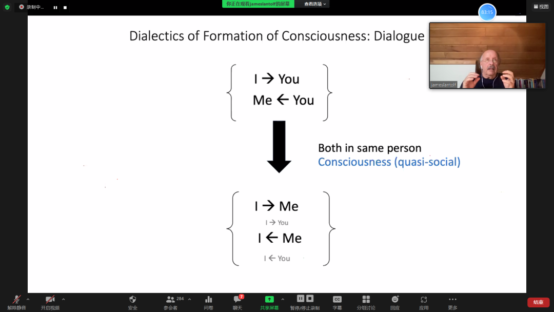 北京时间9月23日晚第二讲开讲,题为“The Genetic Method”。在第二讲中,Lantolf教授主要介绍了Vygotsky对当时的心理学的方法论的看法和观点。首先,Lantolf教授从“Methodology”和“Method”的概念区分出发,提出方法论的发展是所有科学发展的核心。其次,Lantolf教授详细介绍了Vygotskt提出的“Crisis in psychology”的内涵和深意。紧接着,他进一步阐述了“Metaphysics”的概念及其和心理学的联系。基于此,Lantolf教授还探讨了心理学和其他一般的自然科学的差异。然后,Lantolf教授提出了人类意识的功能系统的模型,其中各个因素相互影响作用,并与外界的社会现实产生互动。最后,Lantolf教授提出心理学的方法论的发展应该在辩证法的基础上进行。