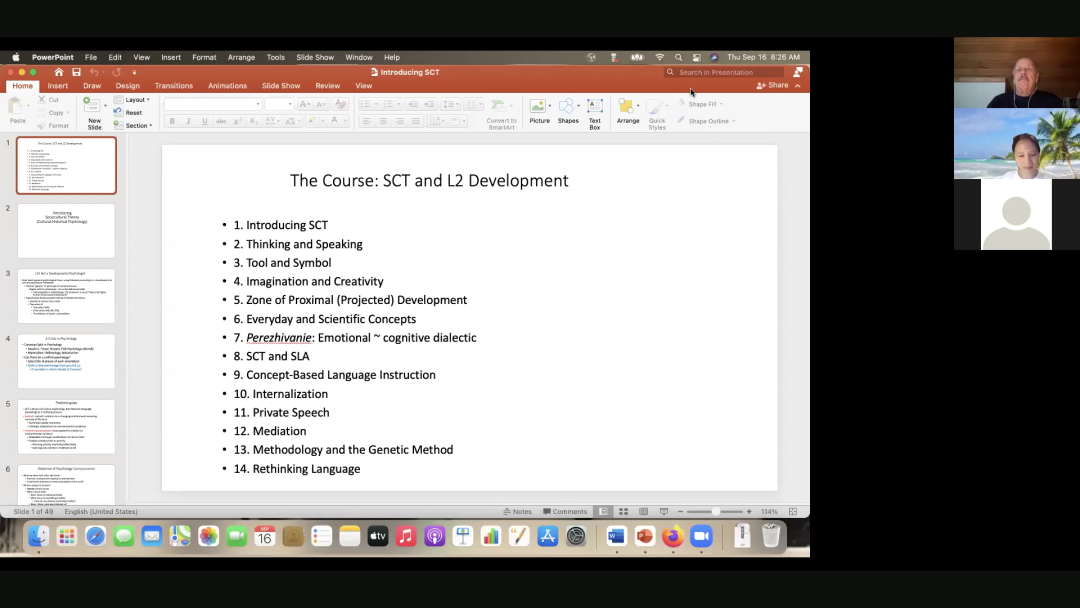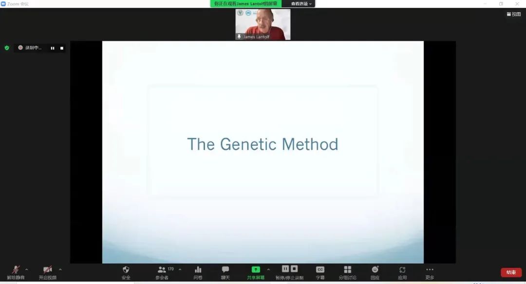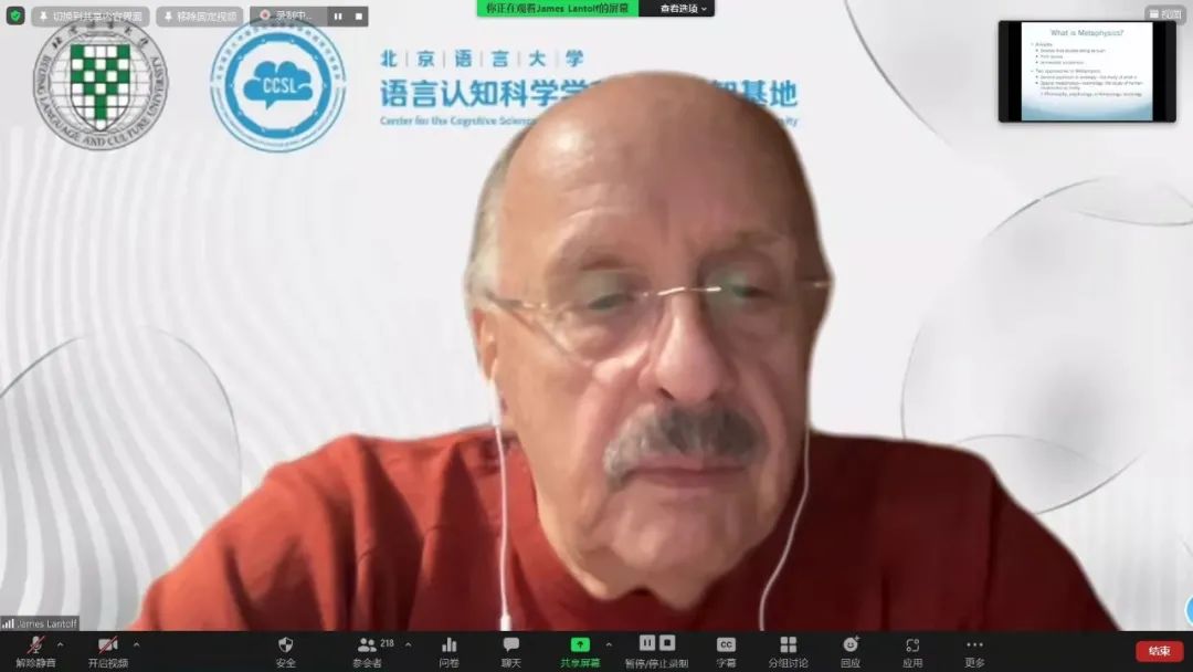 近期,北京语言大学语言认知科学学科创新引智基地特聘教授James Lantolf的研究生国际课程已正式开讲,课程名称为“Principles of Sociocultural Psychological Theory and Their Application to L2 Education and Development”(社会文化理论及其在第二语言教育与发展中的应用)。截止目前,James Lantolf教授已讲授了两次课,课程采用ZOOM线上会议模式,由语言认知科学学科创新引智基地副主任蒋荣副教授主持,两次课一共吸引了500余位国内外师生参加。