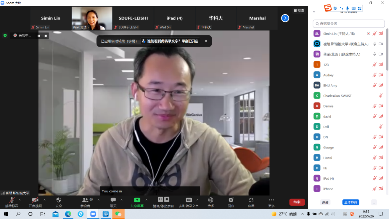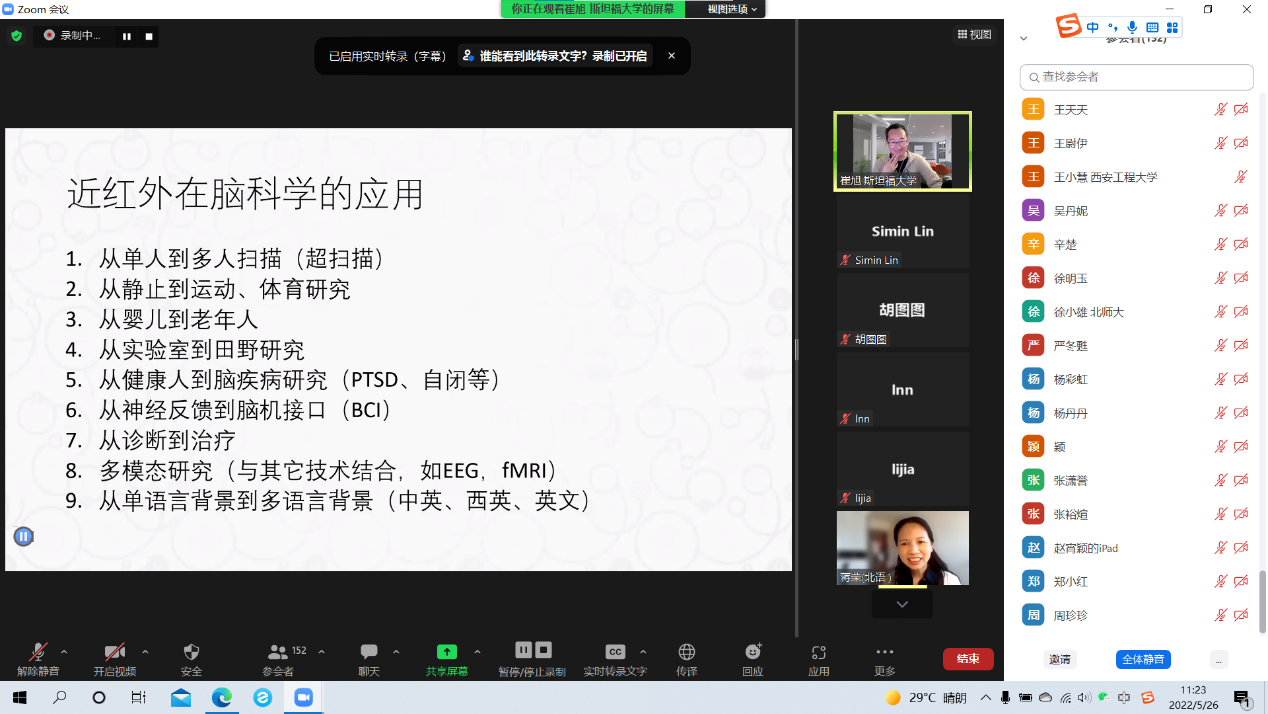 2022年5月26日,应基地邀请,美国斯坦福大学人类精神及行为系崔旭研究员为我校师生做了一场精彩学术报告,报告题目为“近红外和超扫描技术在脑科学的应用及案例分析”,报告使用ZOOM在线上举行。本次报告是基地主办的“第四届语言习得、认知与脑科学学术论坛”第一讲,报告由基地副主任蒋荣主持,校内外共155人参加。