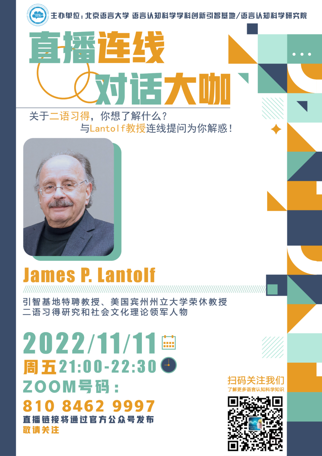 北京语言大学语言认知科学学科创新引智基地公众号推出“对话大咖”专栏,基地将邀请学术大师进行学术经验分享和交流。本次分享基地研究生新生与基地特聘教授、美国宾夕法尼亚州立大学James Lantolf教授进行的学术交流。