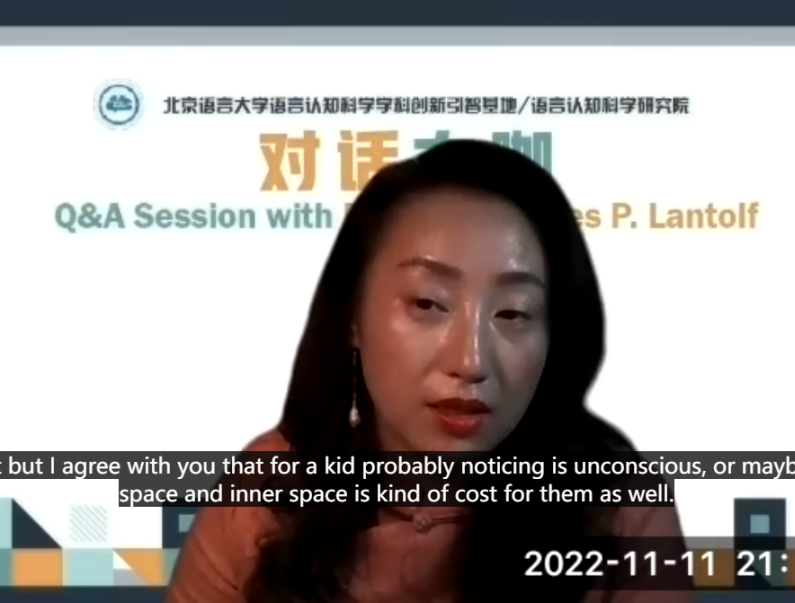 2022年11月11日,语言认知科学学科创新引智基地线上举办了“对话大咖”首场活动。活动邀请基地特聘教授、美国宾州州立大学荣休教授James P. Lantolf做主讲嘉宾,邀请大连外国语大学秦丽莉教授、北京华文学院贾琳讲师做对话嘉宾。引智基地副主任蒋荣、科研秘书任可歆共同主持,活动持续两小时,在线师生人数最高达160人。