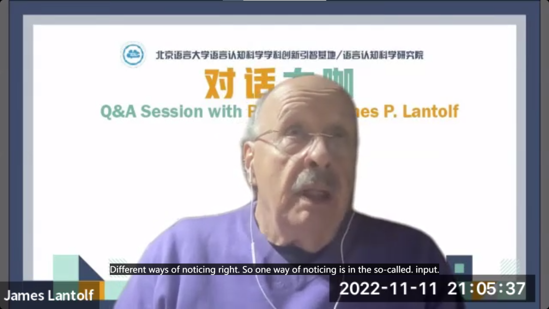 本场“对话大咖”活动分为三个环节:一是暖场问答环节。Lantolf教授解答了提前收集的学术问题,他对“如何解释语言学习与注意假说的相关性?”“为什么语言学习会引导学习者对知识的注意力的增加?”“'Perezhivanie'与活动理论中意义构建概念的区别与联系分别是什么?”等问题进行了详细解答,还分享了他对维果斯基活动理论的理解、实验研究方法的具体运用。