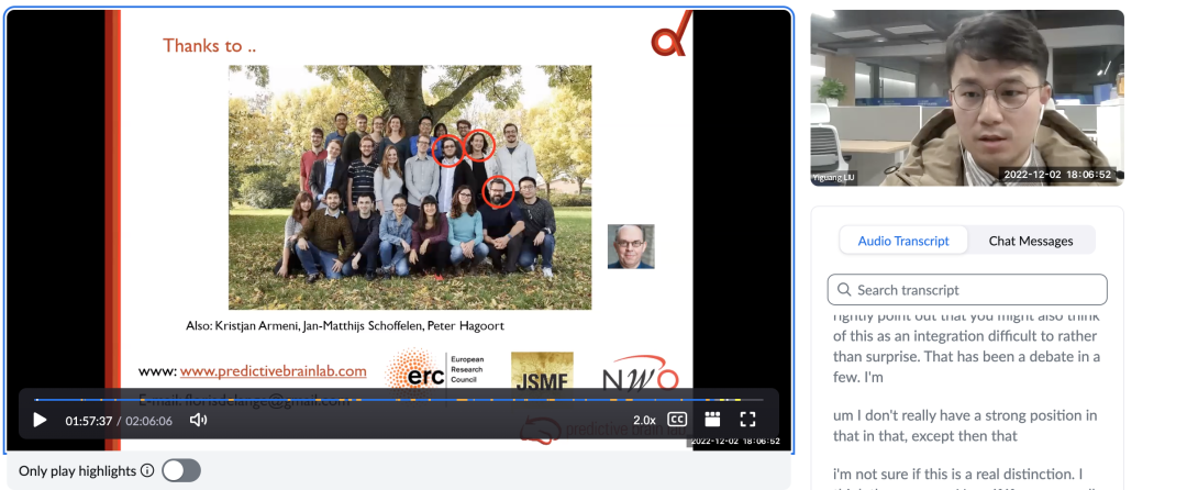 2022年12月2日,应基地邀请,荷兰奈梅亨大学唐德斯脑、认知与行为首席研究员Floris de Lange教授在线上为我校师生做了一场精彩的学术报告,报告题目为“Prediction in Language Comprehension”,此报告是基地“第四届语言习得、认知与脑科学论坛(四)”的第四讲。报告由基地专职科研人员何涛博士主持,参会人员高达两百余人。