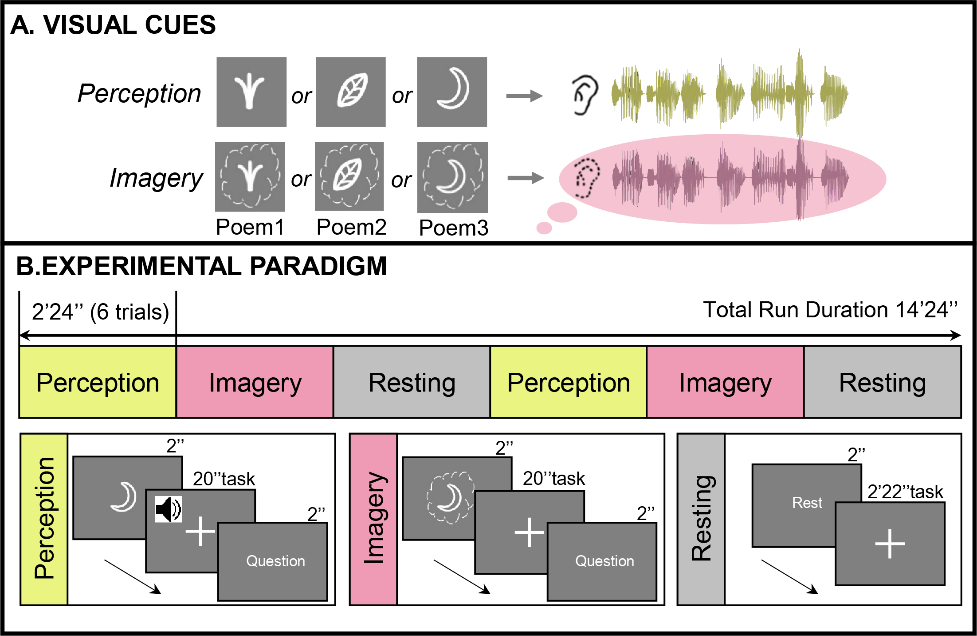 图1,A:通过视觉线索提示真正听到或想象听到三首不同的古诗。B:实验进行言语想象、言语感知和静息态三个条件共六个run的连续扫描。