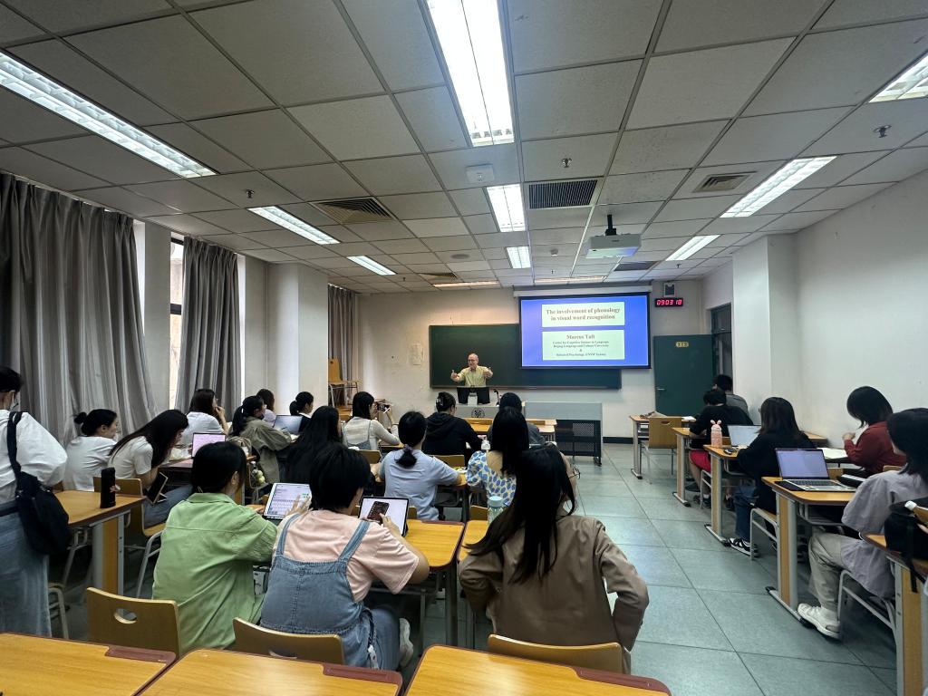 2023年5月12日,Marcus Taft教授为引智基地开设的研究生课程开讲,课程名称为《Phonology in Visual Word Recognition》,本次课程共有三讲,后两讲将在5月19日、26日进行。引智基地全体研究生线下参加课程学习,我校“中文国际传播”中国语言文学拔尖学生培养基地的部分同学也前来参加学习。