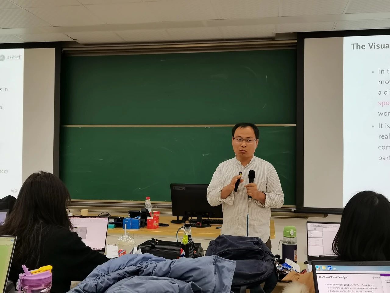 第四部分,北京语言大学语言康复学院战立侃副教授讲授眼动技术在语言认知科学中的一种应用范式——视觉情景范式。战老师结合丰富的文献资料,主要介绍了视觉情景范式的具体内涵、适用方向、研究思路和数据分析方法。他还指出该范式存在的一些问题和未来可以深入研究的几个方向。