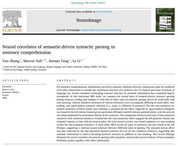 Yun Zhang, Marcus Taft, Jiaman Tang, Le Li*. 2024. Neural correlates of semantic-driven syntactic parsing in sentence comprehension. NeuroImage. 289, 120543.