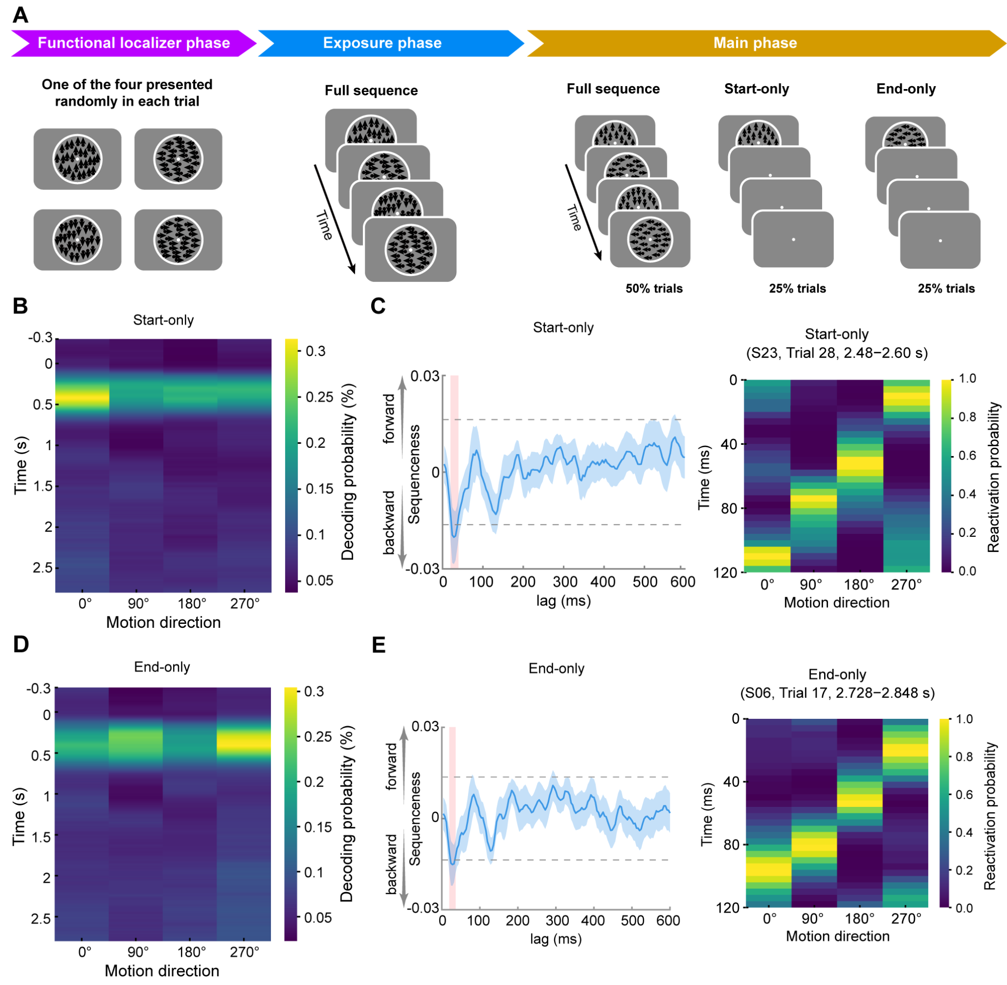 图1 (A)实验1的范式和流程图。被试首先反复观看由4个运动方向组成的固定视觉序列(Exposure phase)。在随后的主任务(Main phase)中,部分试次中仅呈现序列的第一个或最后一个运动方向(作为线索),另一些试次则呈现完整的视觉序列。被试只需对完整序列进行一致性判断。(B)仅呈现序列的第一个运动方向作为线索时,空屏期无法解码出特定的运动方向。(C)仅呈现序列的第一个运动方向作为线索时,左:运动方向形成的序列被以时间压缩的方式进行神经活动反向回放;右:一个代表性被试的神经活动反向回放示例图。(D)仅呈现序列的最后一个运动方向作为线索时,同B。(E)仅呈现序列的最后一个运动方向作为线索时,同C。