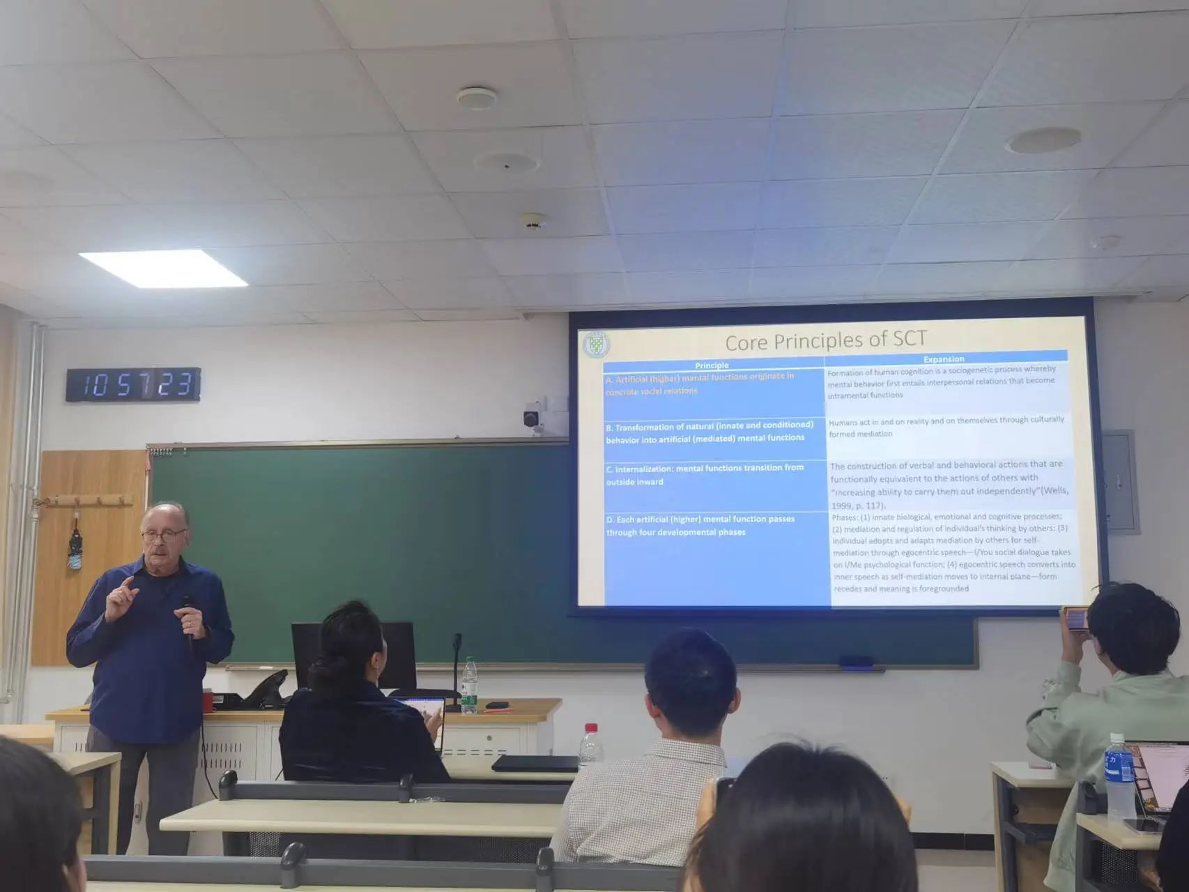 10月9日,James Lantolf教授主讲的研究生国际课程《Sociocultural Theory (Cultural-Historical Psychology)》第一次课开讲,校内外近三十位师生参加了课程学习,本次课上主要介绍了社会文化理论(SCT)。