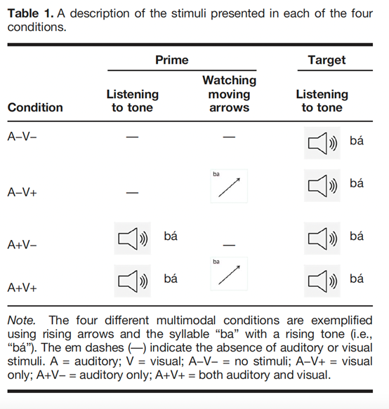 本研究包含三个实验,分别以无声调语言经验说话人、初级普通话二语学习者和汉语母语者为被试。实验采用启动范式,选用普通话二声和四声的听觉刺激作为目标项,要求被试根据音高上升还是下降进行又快又准的声调判断。视觉信息采用移动箭头这一符号化手段描绘声调的音高轮廓,上升箭头对应二声,下降箭头对应四声。启动项呈现的是四种不同的多模态条件(见表1):1)仅视觉刺激(A-V+);2)听觉和视觉刺激(A+V+);3)无刺激(A-V-),作为A-V+的控制条件;(4)仅听觉刺激(A+V-),作为A+V+的控制条件。实验同时针对听觉刺激操纵了语音变异性,分为高变异刺激(发音人为三男三女,每人各一遍)和低变异刺激(发音人为一名男性,同样的刺激发音六遍)。实验记录了声调辨认的准确率和反应时,并计算了反映声调区分能力的d’值。